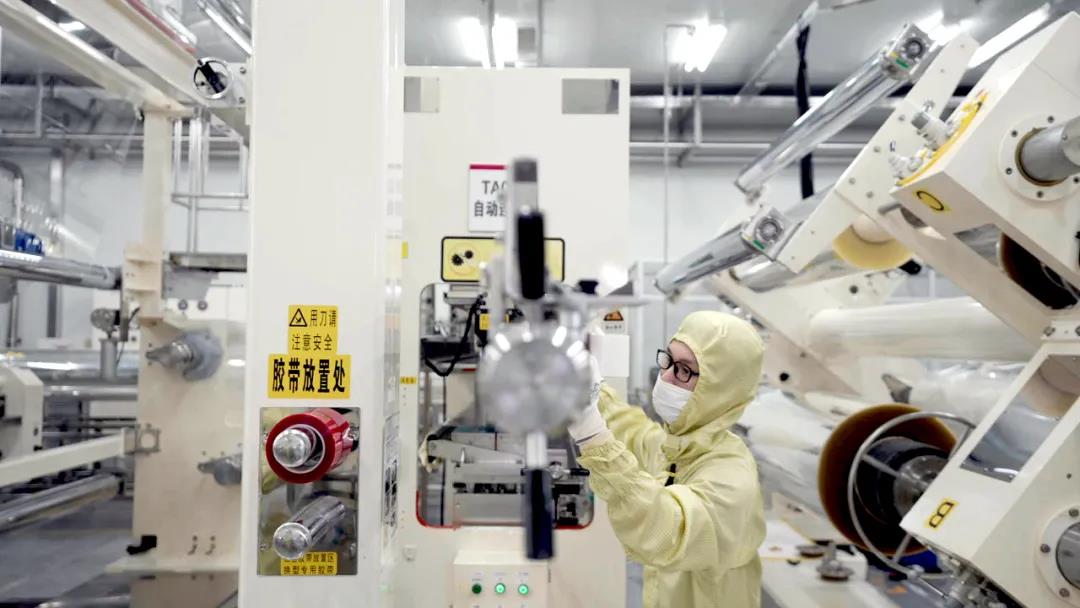 在杉金光電工作人員身著防塵服正仔細巡查南京、廣州各4條自動化產線稼動晝夜不停生產顯示器核心材料——偏光片。
